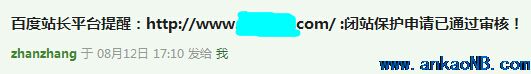 2014年8月11日接到空間商通知,因為網(wǎng)站備案號被注銷,網(wǎng)站被關閉。晴天霹靂!想了很久才反應過來,一年前搞了快速備案,換空間的時候一直沒有改接入,所以才被注銷了。為了能快速打開網(wǎng)站,我只好再次找快速備案的渠道。正好又遇到周末,預估備案下來要5天左右,這時只能選擇百度的閉站保護,否則肯定會被降權(quán)的。