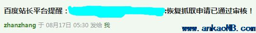 我是8月16日申請的恢復,到時是周末,我想要周一才能知道結(jié)果。結(jié)果出乎意料,百度8月17日凌晨給我回信,說審核通過??磥碇苣┮彩强梢陨暾堥]站保護恢復的。