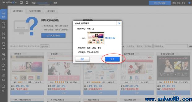 走到這一步,建站過程基本上就完成了一半,進入你的網(wǎng)站后臺,首先第一步就要在建站寶盒提供的上千套網(wǎng)站模板中挑選一套你中意的模板了,模板提供預覽功能,看重之后,點擊模板下方的“安裝”鍵,開始安裝。