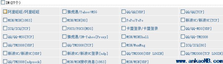 | IM控制 | 可分組、分用戶、分時(shí)段封堵所有聊天軟件如:QQ、MSN、新浪UC、Yahoo Messenger、網(wǎng)易泡泡、Skype、飛信等 | |
