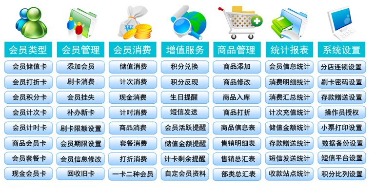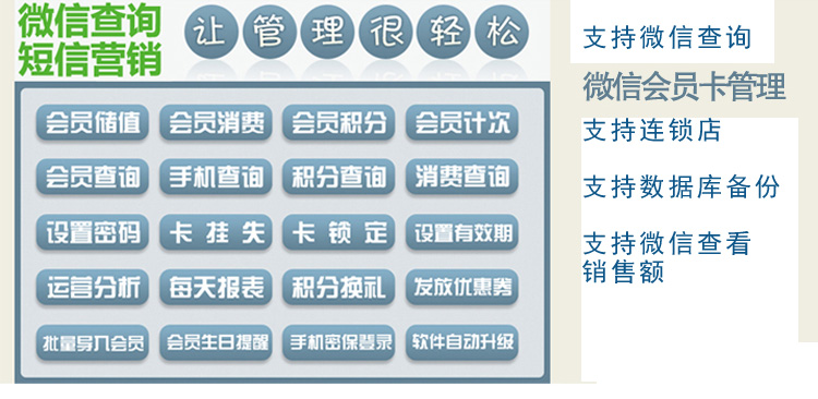 會(huì)員儲(chǔ)值,散客消費(fèi),沒(méi)帶卡通過(guò)手機(jī)號(hào)碼消費(fèi),積分返現(xiàn),會(huì)員價(jià)格打折,刷卡密碼操作,短信平臺(tái),微信在線查詢等全面的功能管理